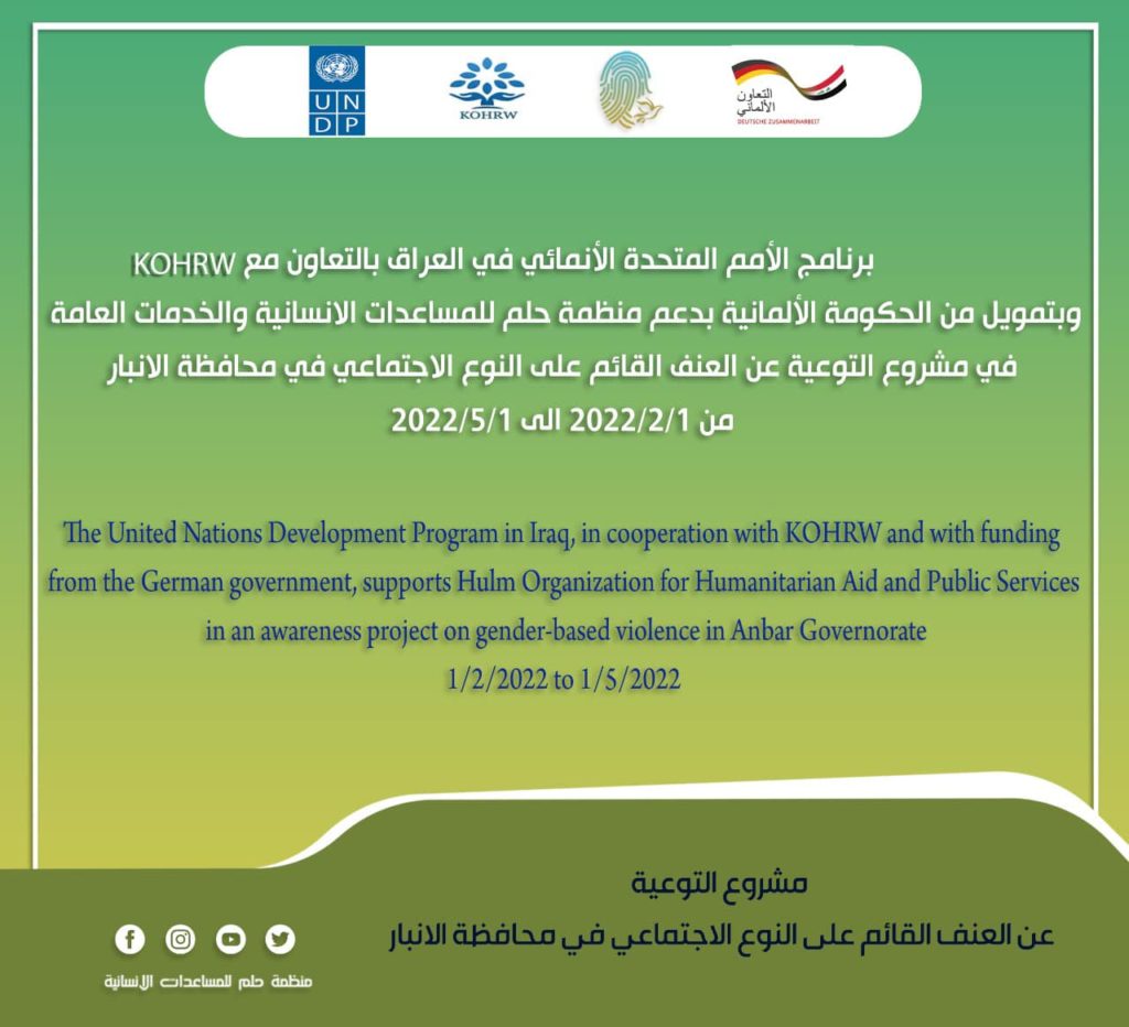 12 مارس، 2022العمل المستمر في تنفذ مشروع التوعية بالعنف القائم على النوع الاجتماعي في محافظة الانبار قضاء الفلوجة ضمن برنامج الأمم المتحدة الانمائي و بدعم و تمويل ...