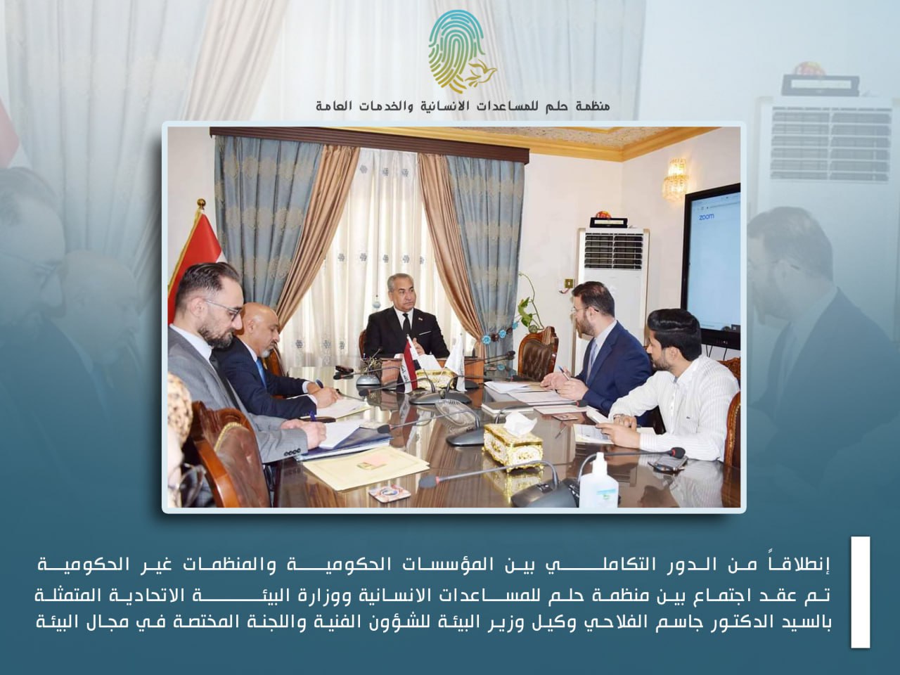A meeting was held between the Dream Organization for Humanitarian Aid and the Federal Ministry of Environment represented by Dr. Jassim Al-Falahi, Deputy Minister of Environment for Technical Affairs, and the specialized committee in the field of environment.